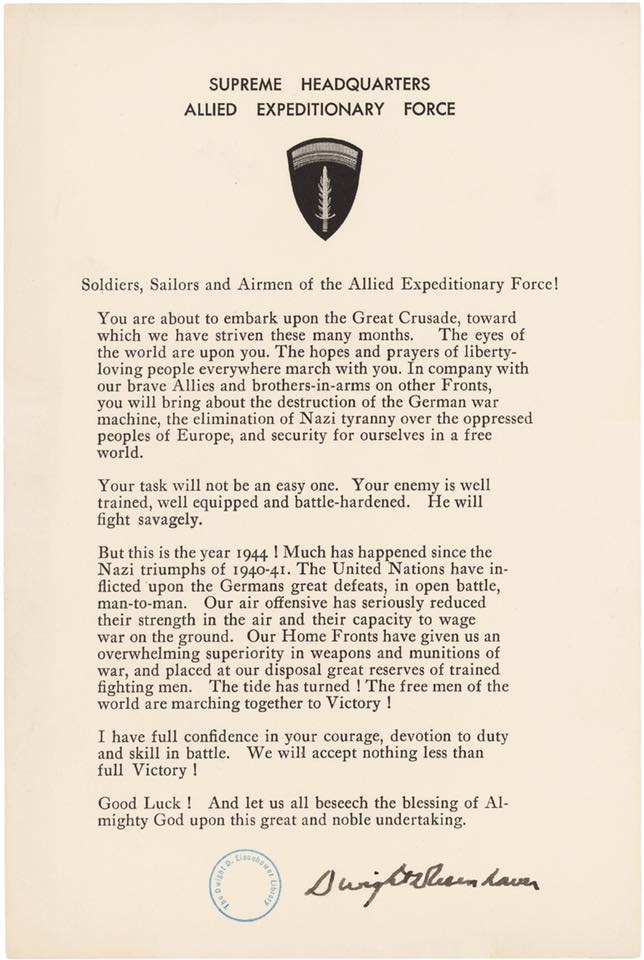 After a long moment (Everyone in the room would describe it later as the longest moment of their lives), Eisenhower simply said, “Ok, let’s do it”, and stood up and walked out of the room. One of his last official acts was authorizing the 6 June 1944 Order of the Day for release. Known today as the “Great Crusade” speech, one copy was issued to over 175,000 soldiers, sailors, and airmen of the assault force that night.