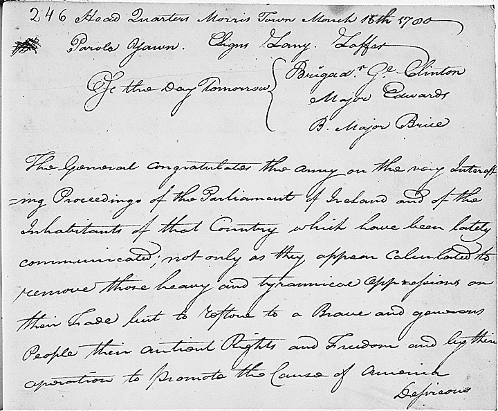 The general congratulates the army on the very interesting proceedings of the parliament of Ireland and the inhabitants of that country which have been lately communicated; not only as they appear calculated to remove those heavy and tyrannical oppressions on their trade but to restore to a brave and generous people their ancient rights and freedom and by their operations to promote the cause of America.