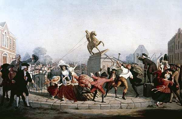 When the Declaration was read to the local 4th New York Regiment, the inspired residents of the city marched over to Bowling Green Park, and pulled down the statue of King George III at its center. They carried the King over to a local blacksmith and had him melted down for musket balls.